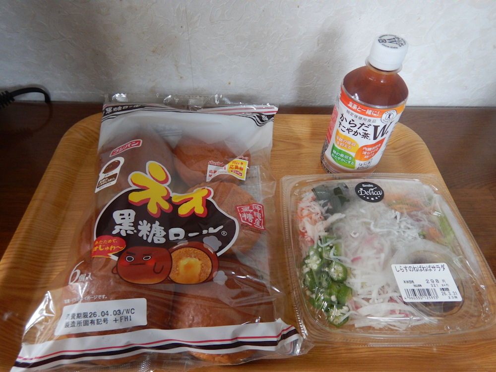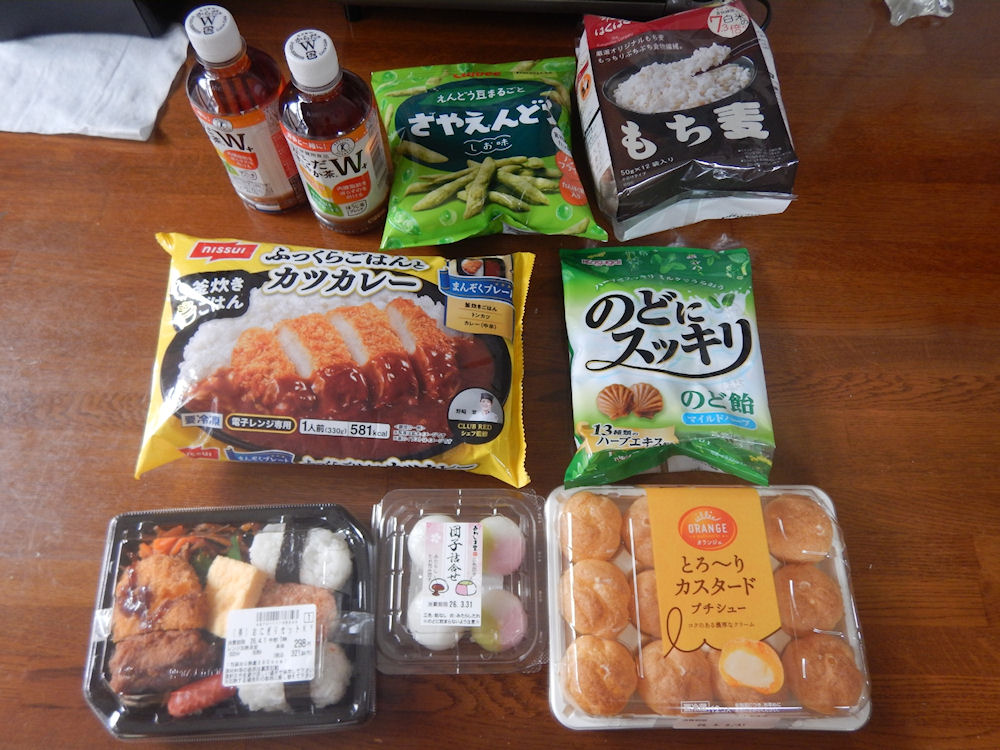 買ったのは「おにぎり弁当(321円)」、「あわしま堂の「団子詰合せ(三色団子・みたらしたれ包み)4個入」(105円)」、「オランジェ「とろ~りカスタードプチシュー(187円)」、「ニッスイ「まんぞくプレート・ふっくらごはんとカツカレー(453円)」、「春日井「のどにスッキリマイルドハーブ(213円)」、「「コカ・コーラ「からだすこやか茶W+(172円)」、「カルビー「さやえんどうしお味(105円)」、「はくばく「もち麦ご飯(591円)」。
