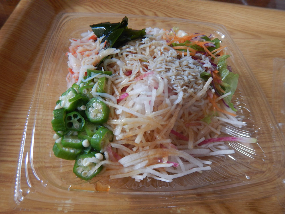 サラダは、大根、おくら、わかめ、しらす、カニ風味かまぼこ、グリーンリーフ、ニンジン、赤キャベツ、紅芯大根が入っています。