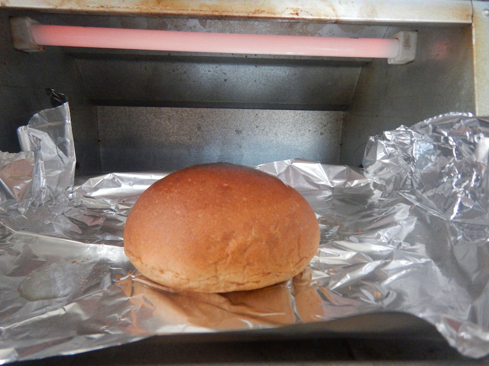 まずは、オーブントースターです。余熱1分(空焼き)した1000Wのオーブントースターで1分間、焼きました。
