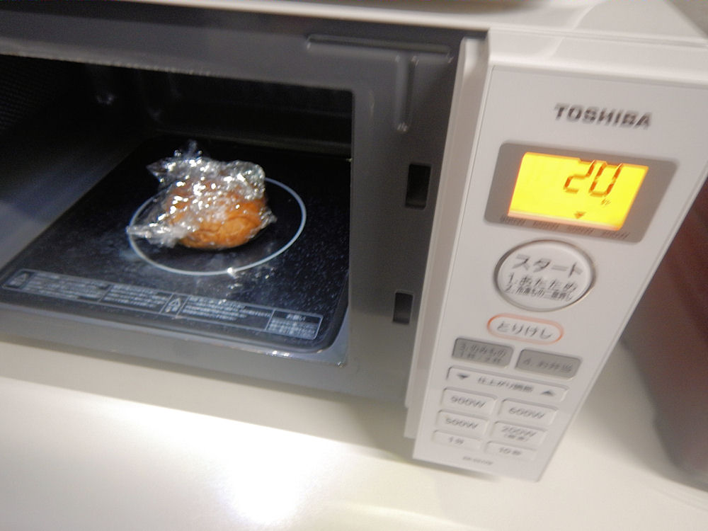 次は電子レンジです。ラップで包んだネオ黒糖ロールを500Wで20秒、温めました。