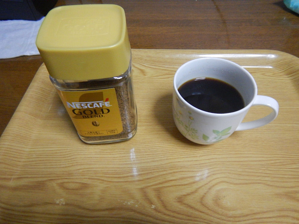 スプーン3杯のネスカフェゴールドブレンドをコップに入れて、お湯。