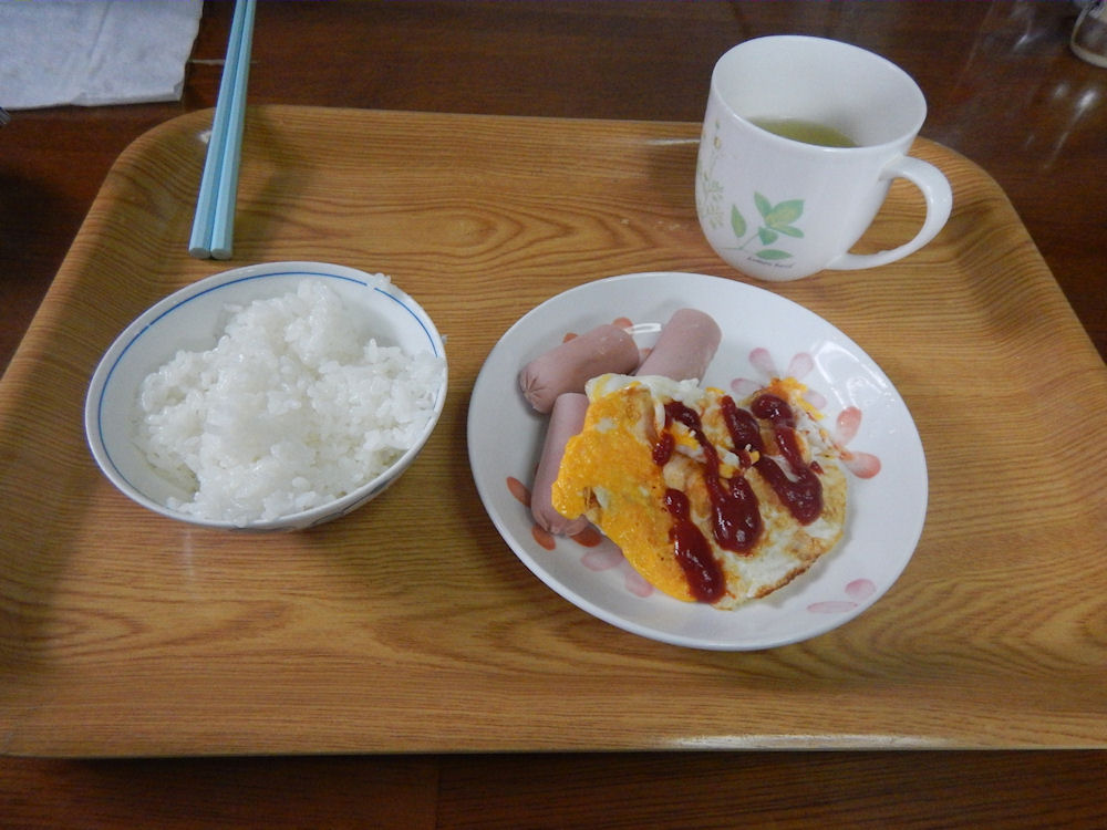 朝食を作ったのは午前7時0分ごろ。今朝の朝食は、目玉焼きの両面焼きと、おさかなソーセージと、白いご飯。