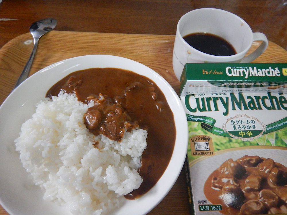 11時30分になって、お腹が空いてきたので昼食。昼食は、ハウス食品の「カレーマルシェ(中辛)」と、ブラック珈琲。