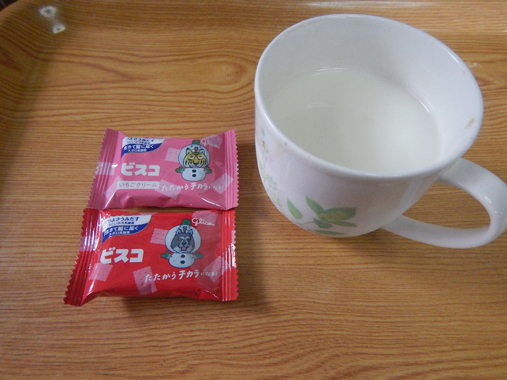 牛乳を飲みながら、ビスコの「ミルククリーム」と「いちごクリーム」を食べました。塩味が美味しい、ミルククリームの方が好きです。