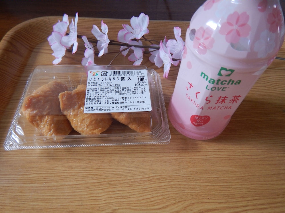 抹茶なら和菓子ですけど、さくら抹茶なので「いなり寿司」にしました。