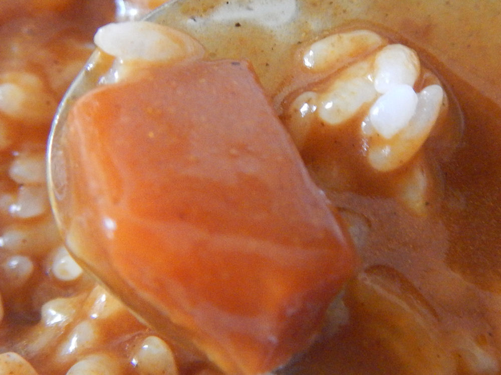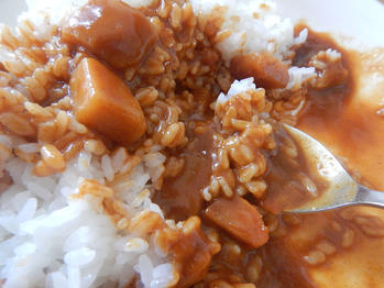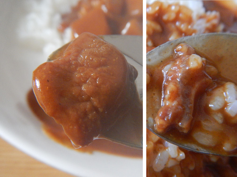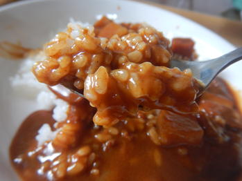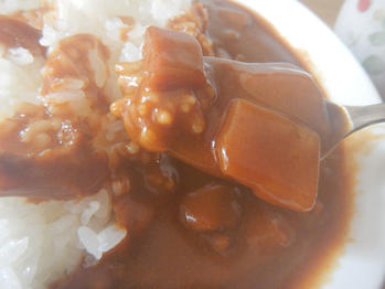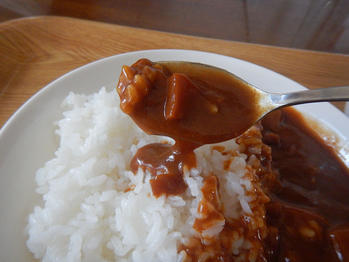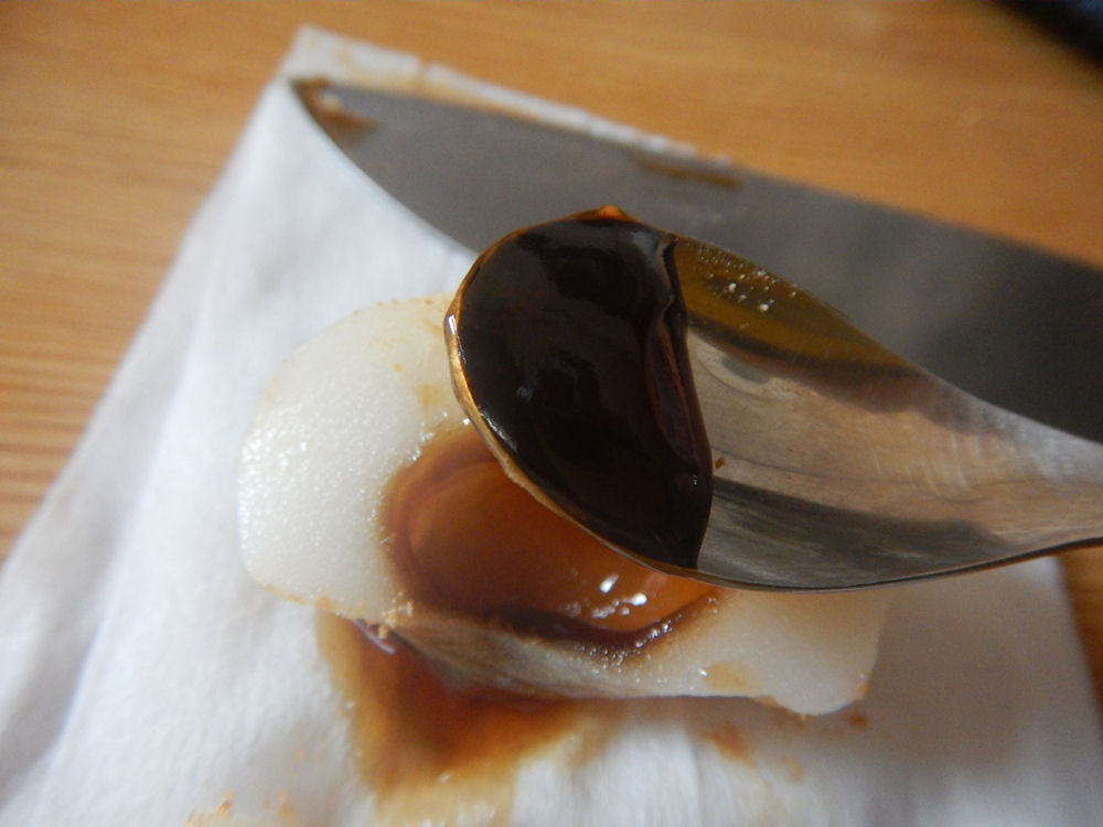 先ほど、包丁で切った団子があるので、最初は、中の黒みつをスプーンで食べました。