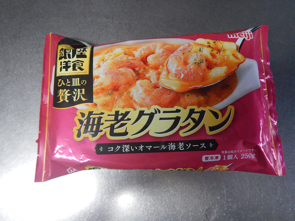 今回調理した冷凍食品は、株式会社明治「銀座洋食海老グラタン」です。株式会社明治と言えばチョコレートや牛乳・ヨーグルト、スーパーカップなどのアイス、銀座カリーなどのレトルトカレーなど、食品メーカーですね。