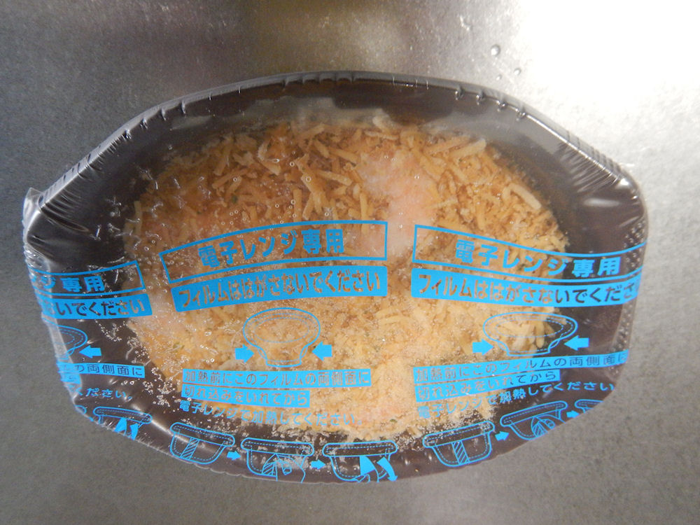 明治の「銀座洋食海老グラタン」を食べます。写真などは夕食です。電子レンジでの調理が終わった海老グラタン。フィルムには水滴が、たくさんですね。