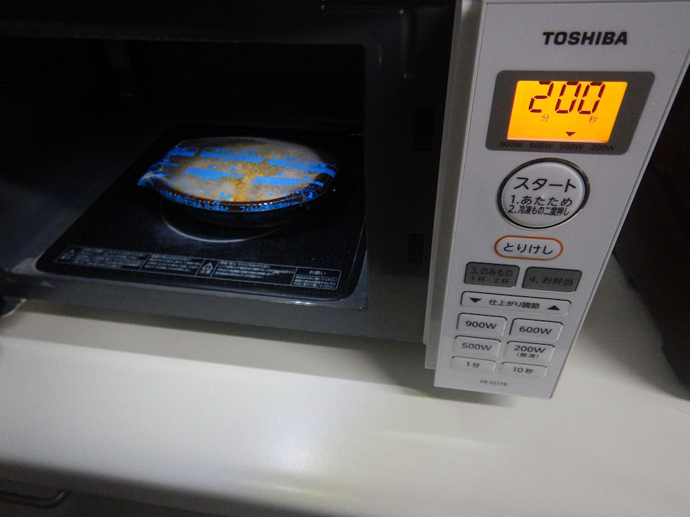 5分30秒たちましたが、私の電子レンジは加熱ムラが多いので、海老グラタンを左右反転(180度)して追加で30秒、温めました。
