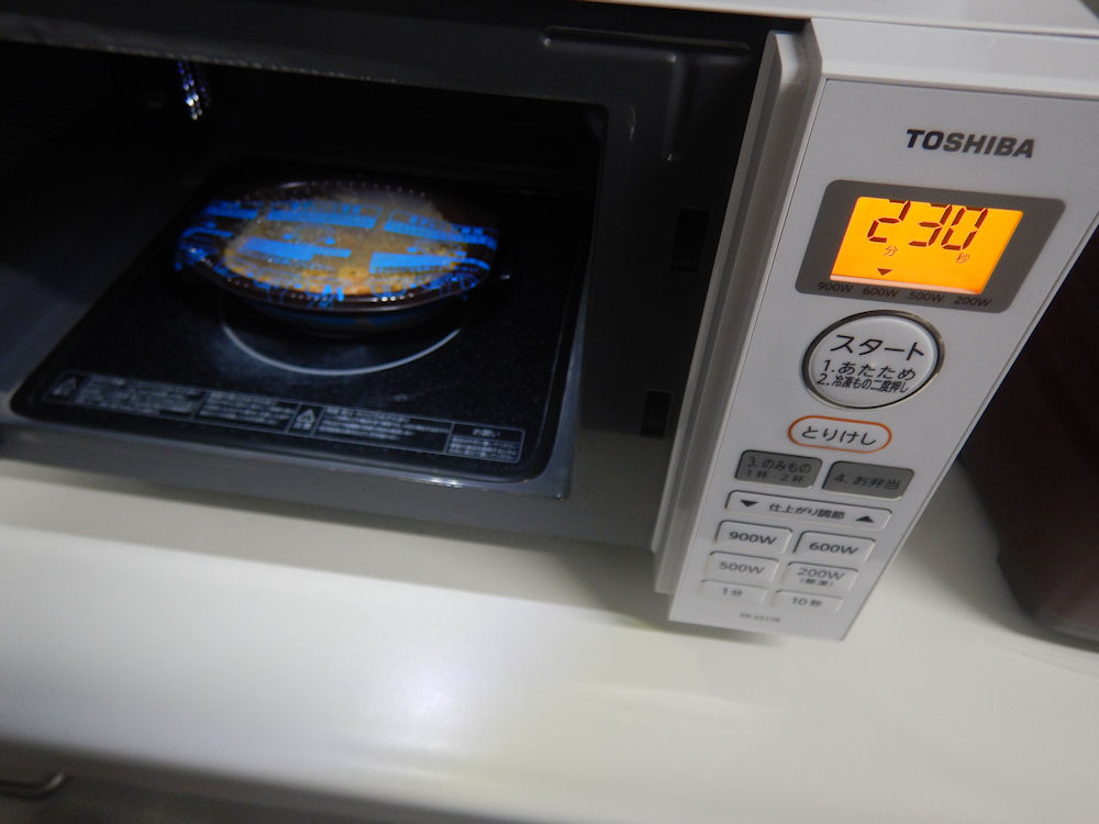 同じく半分の残り2分30秒で扉を開けて、一時停止し、海老グラタンを左右反転(180度)して扉をして、加熱再開です。