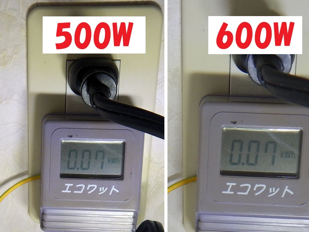 下の写真の左が500Wで調理、右が600Wで調理。消費電力は同じで0.07kw/hでした、