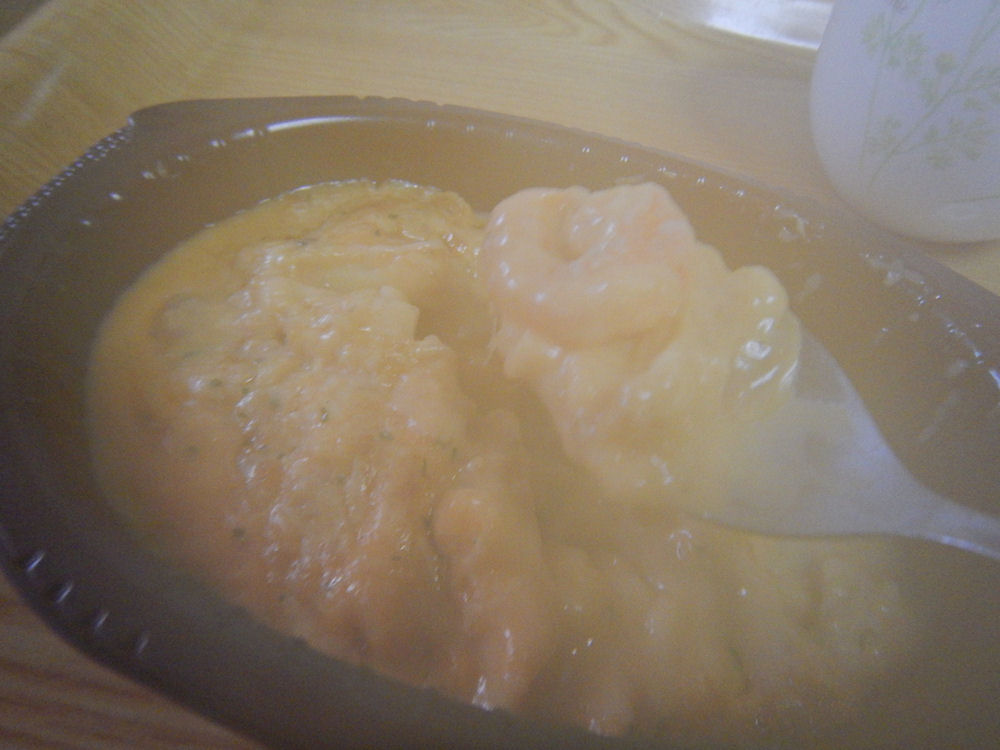 5分たちましたが、私の電子レンジは加熱ムラが多いので、海老グラタンを左右反転(180度)して追加で30秒、温めました。