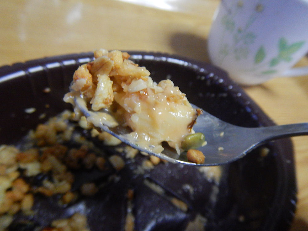 そこで、カルビー株式会社「フルグラ糖質オフ(550g)」を食べました。銀座洋食海老グラタンを食べた後に容器に、1食分(約50g)を入れます。ドリンクは電子レンジで温めた牛乳です。