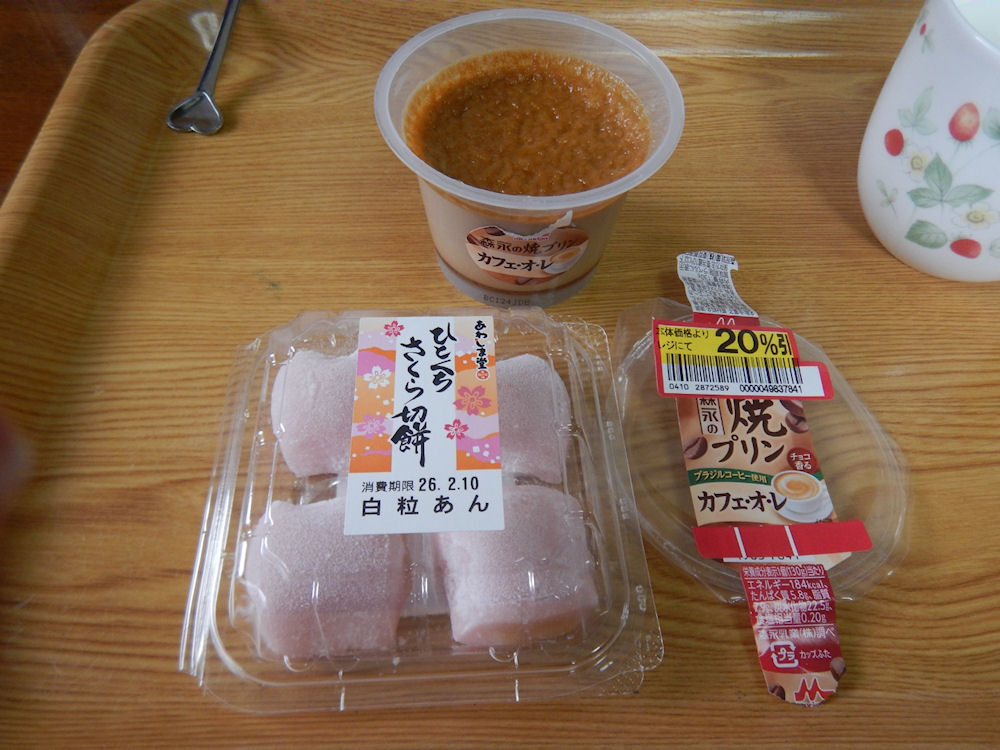 最初は、あわしま堂の「ひとくちさくら切り餅」を買ったけど、ふとプリンやケーキなどが置いてある売り場に行ったら「森永の焼プリン カフェ・オ・レ」が20%引きで売っている。。。20%、20%引き。買っちゃいました😅