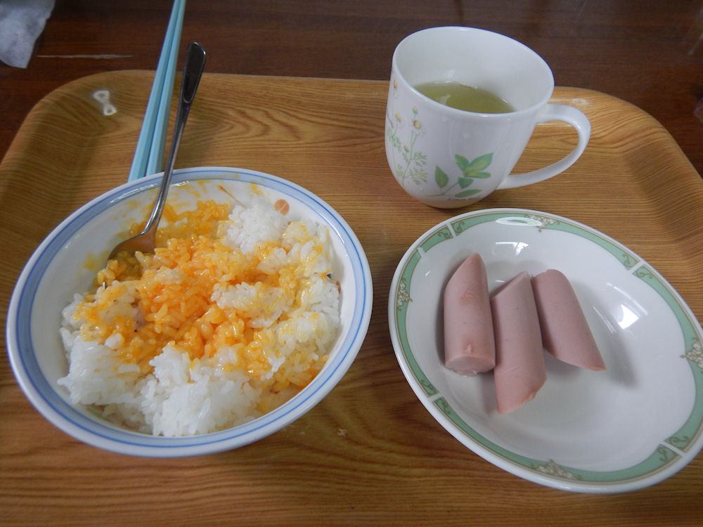 卵かけご飯以外は、トップバリュ「塩分30%カット DHA・EPA入り おさかなソーセージ」(4本で238円(税込257円))と、日本茶(玄米茶)です。