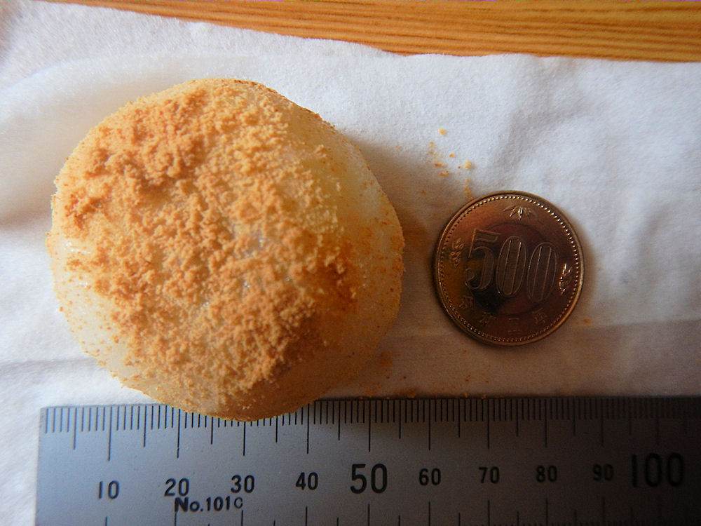 大粒の団子なので、その大きさを測ってみました。直径で約55ミリ、500円硬貨の2倍ぐらいですね。
