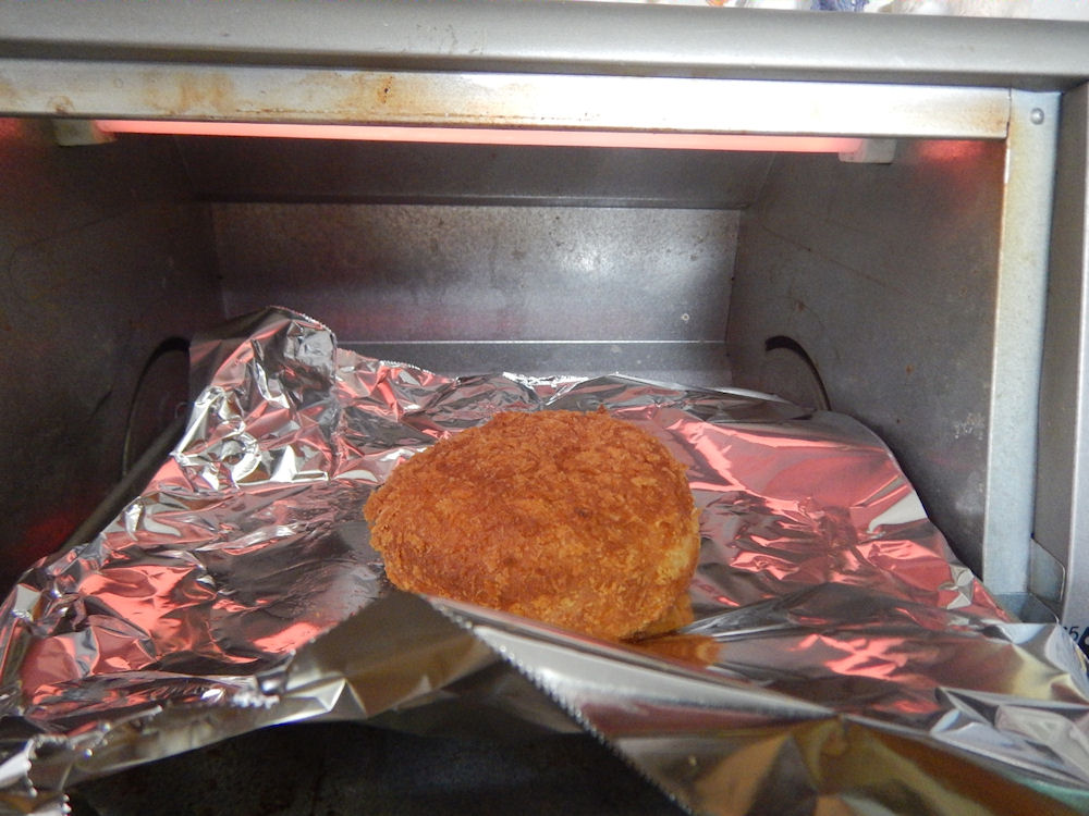 電子レンジでチンするだけの冷凍食品のハンバーグは食感が柔らかいだけですが、オーブントースターで焼く事で、ちょっぴりコロコロ硬めになって、あっさりした塩味と共に美味しいです。