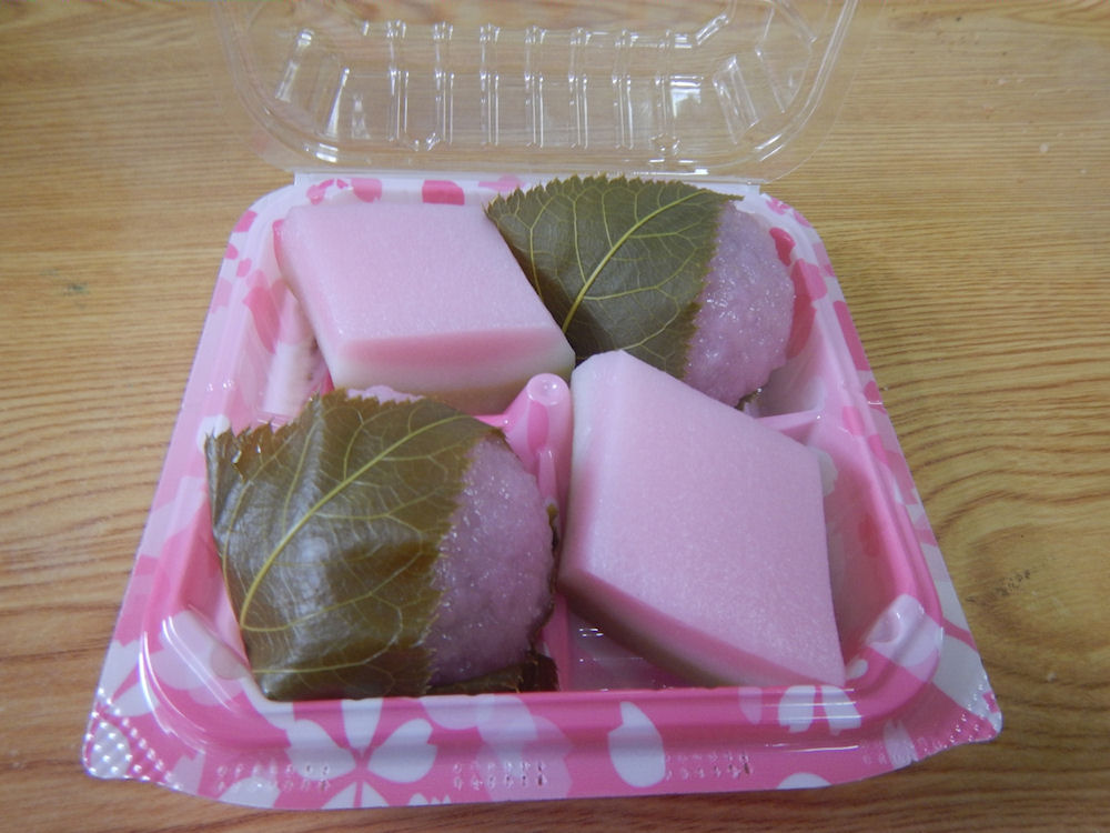 フタを開けると、桜餅の桜の葉の美味しい香りがしてきます。桜餅が2個、ひし餅が2個入っていますね。