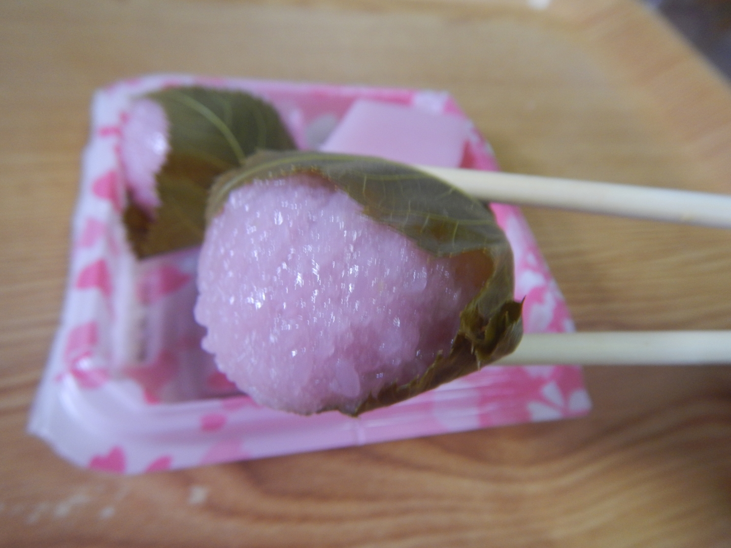 桜の葉は食べれますので、そのまま食べました。葉っぱがサクサク、お餅がモチモチ。葉っぱの酸っぱさと、小豆こしあんの甘さが美味しいです。