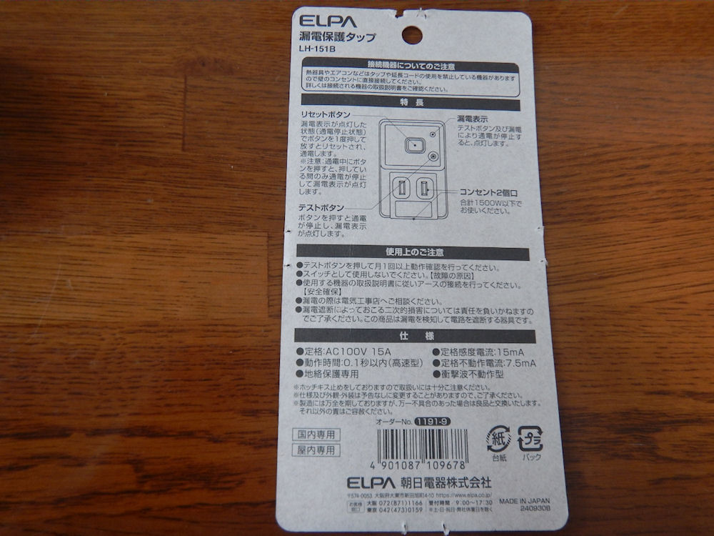 買ったのはELPA(朝日電器株式会社)の「LH-151B」。漏電保護タップは色々あるけれど、大きさを考えて「LH-151B」にしました。