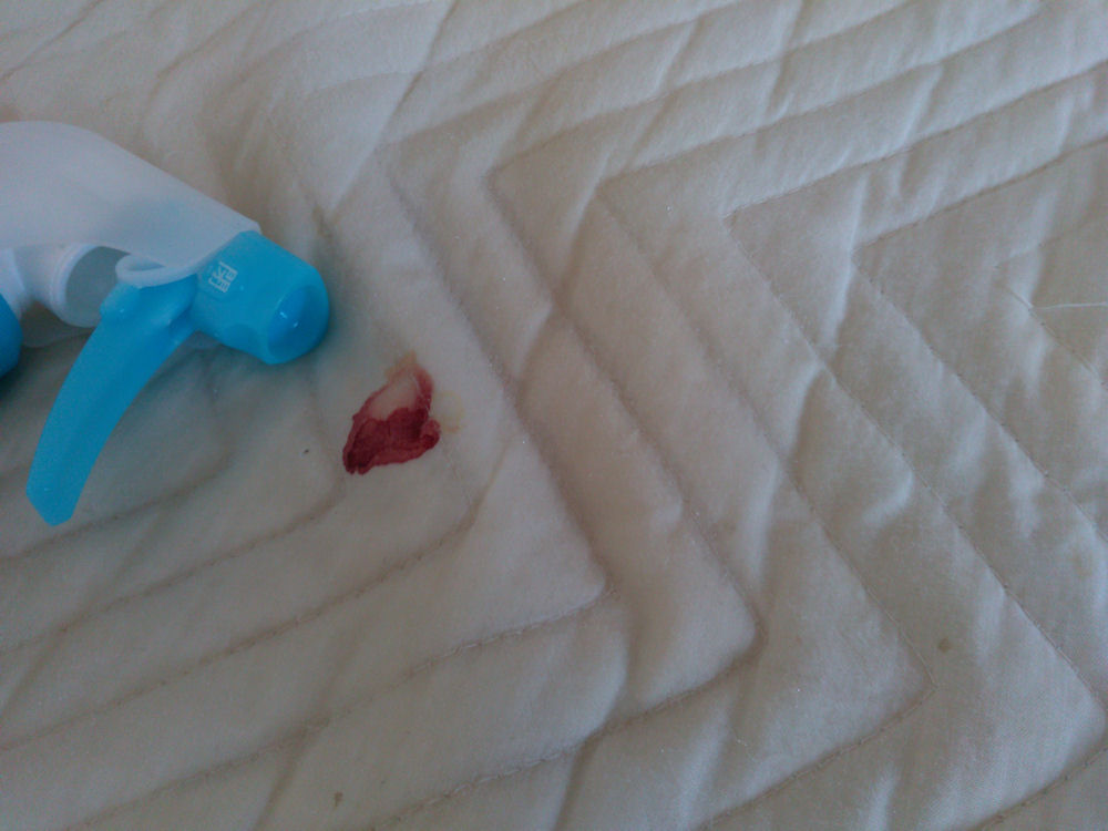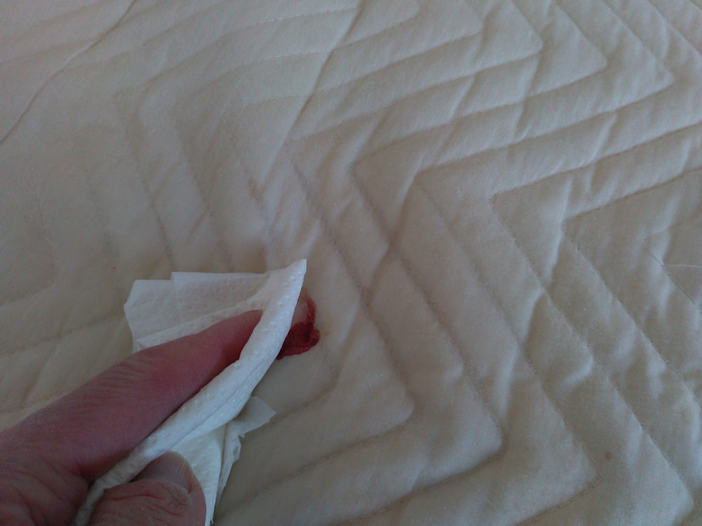NANOXエリそで用を、血液が付いたシーツの上から、押して洗剤を出し、少し擦って、その後、ウエットティッシュで拭きます。