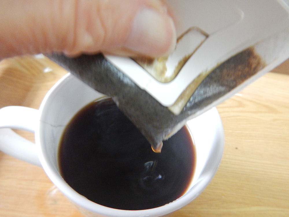 そして最後に、指で押さえて絞り出し。お湯と豆が接する時間が長いほどカフェインが、たくさん出ます。