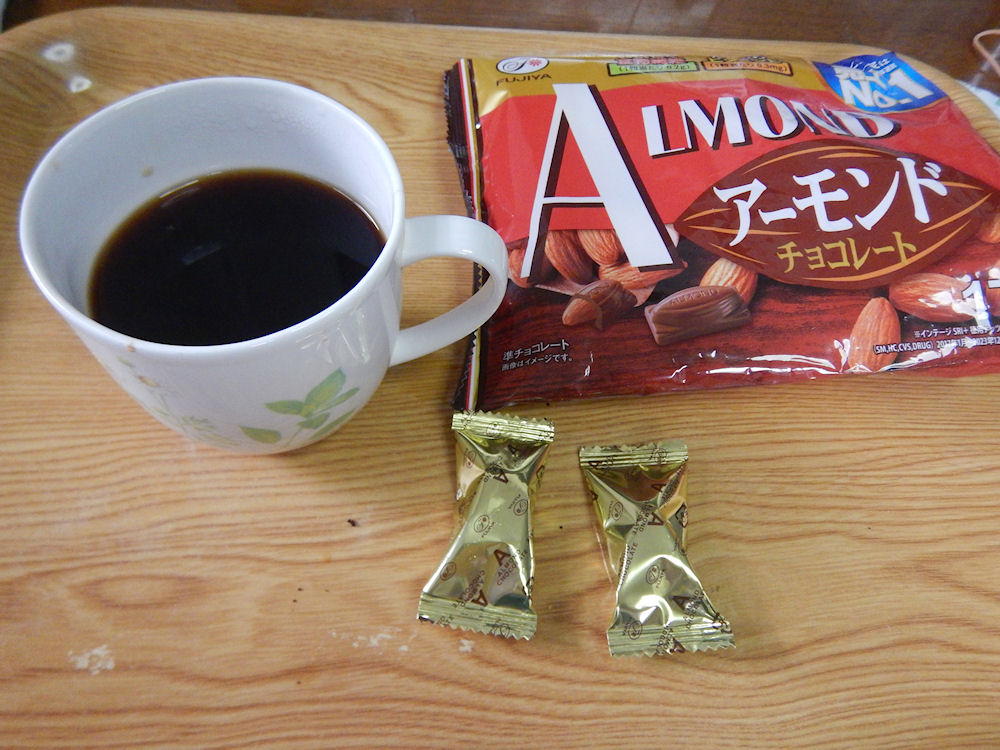スッキリした味の中に珈琲の苦さが広がって美味しい珈琲。これで16杯分が429円は安いです。苦いコーヒーなので、不二家「アーモンド・チョコレート(17粒入り・税込み386円)」を食べながら飲みました。珈琲の苦さでチョコレートのミルク感が美味しいですね。