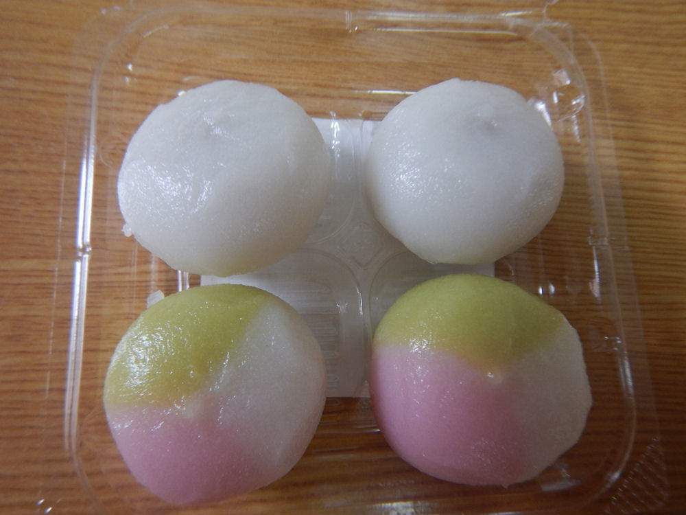 あわしま堂によれば「ピンク・白・緑の三色団子と、とろっとしたみたらしたれを包んだ団子を詰合せました」という三色と、みたらし。奥の白い団子が「みたらしたれ包み」で、手前が「三色団子」です。