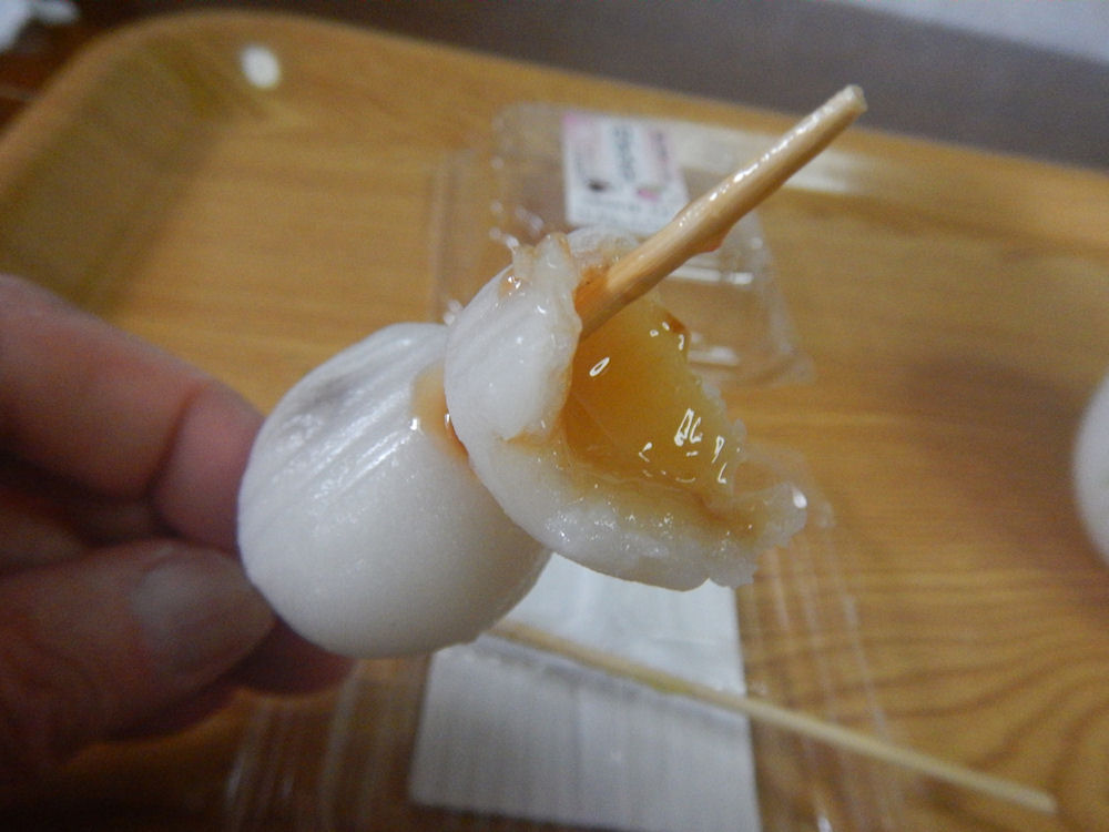 次は、白いお餅の、みたらしたれ包み。三色団子と違い、柔らかくて串を刺しやすいです。中に、みたしタレが入っていますが、串を刺す時にタレが飛び出す事はないです。