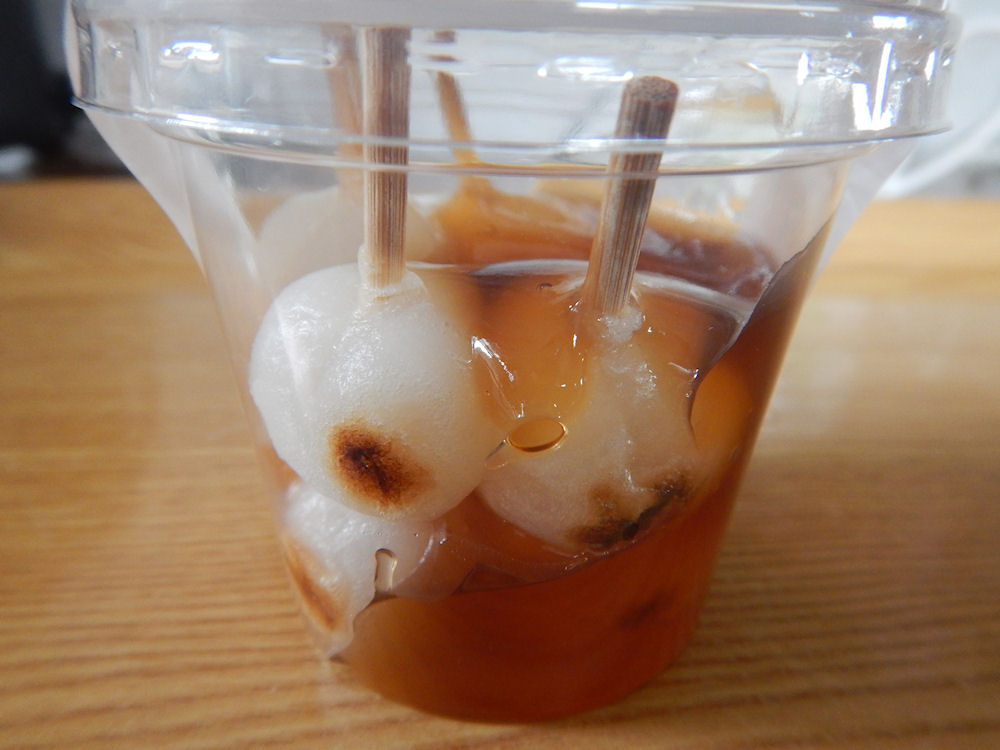 団子を手で持つと、お餅で少しだけベタベタしますね。下の写真はシャトレーゼの「昆布だし香る炙りみたらし団子カップ入(150円(税込162円)」。団子が串に刺してカップに入っています。