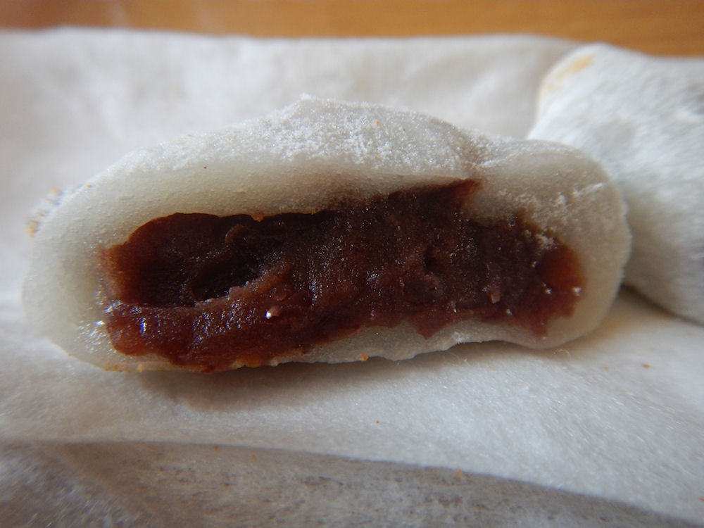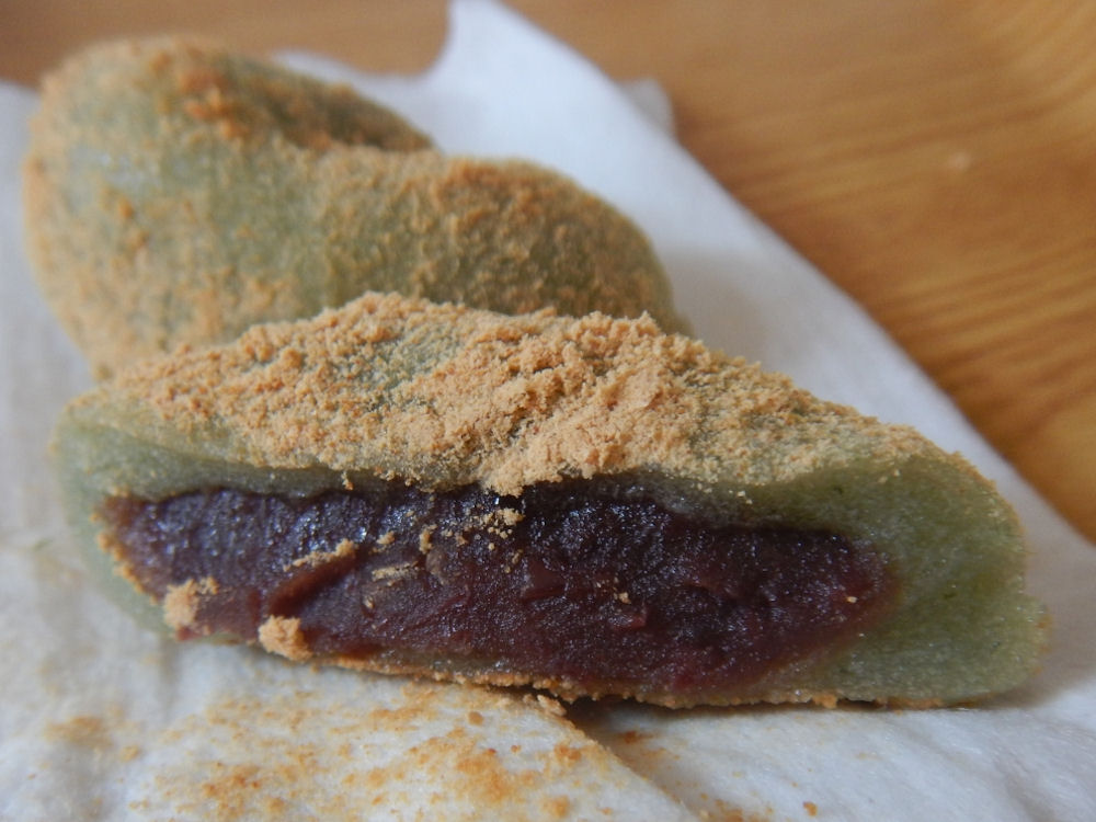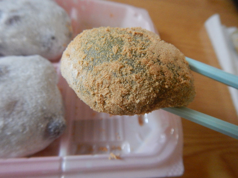 よもぎ大福を食べてみると、モチモチの餅生地に、とろ~り舌触りの粒あん。きな粉の甘さと粒あんの砂糖のような甘さが美味しいです。