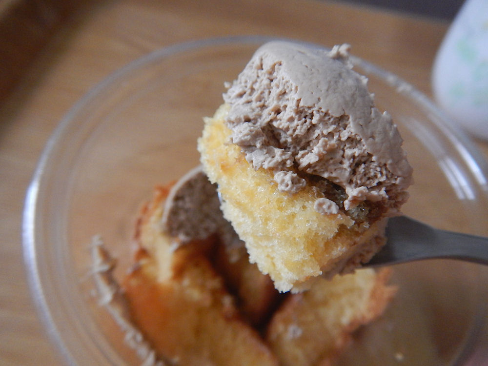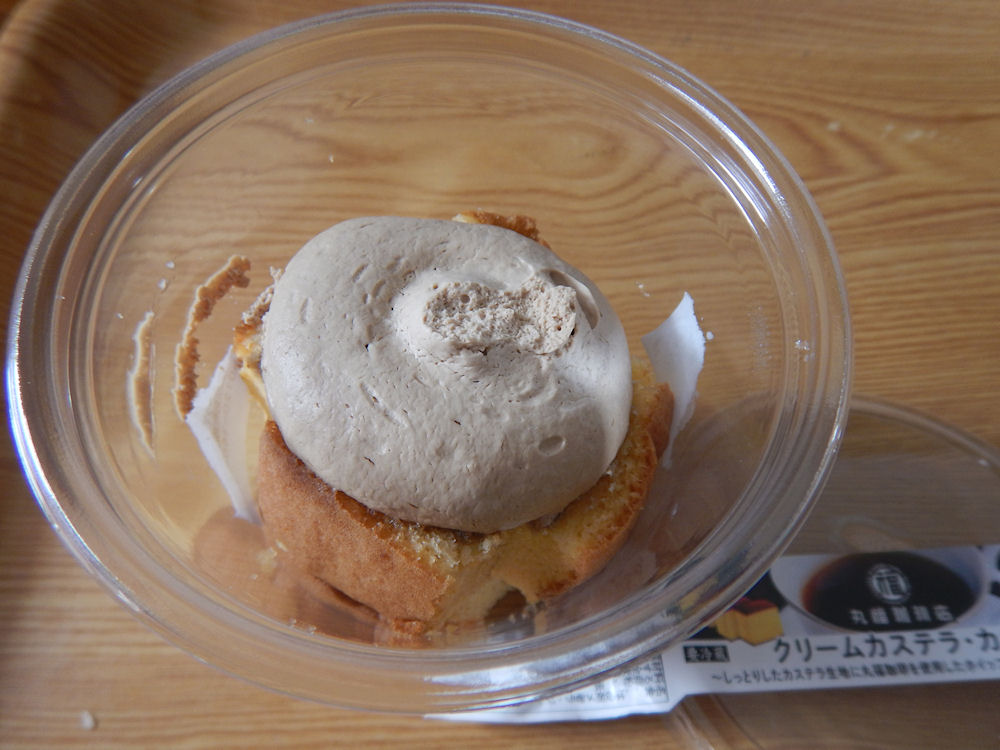 カップをフタを開けました。ほんのちょっぴりカステラの甘い香り。クリームの形が崩れているのは、持って帰る時にカップが横になった影響ですね。スーパーのスィーツでは、よくあります。